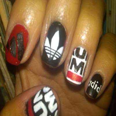 Our fave is the Adidas/Run D.M.C. manicure with the mean original colours. Amazing use of matte black here – shiny would have compromised the clarity of the letters and logo.
