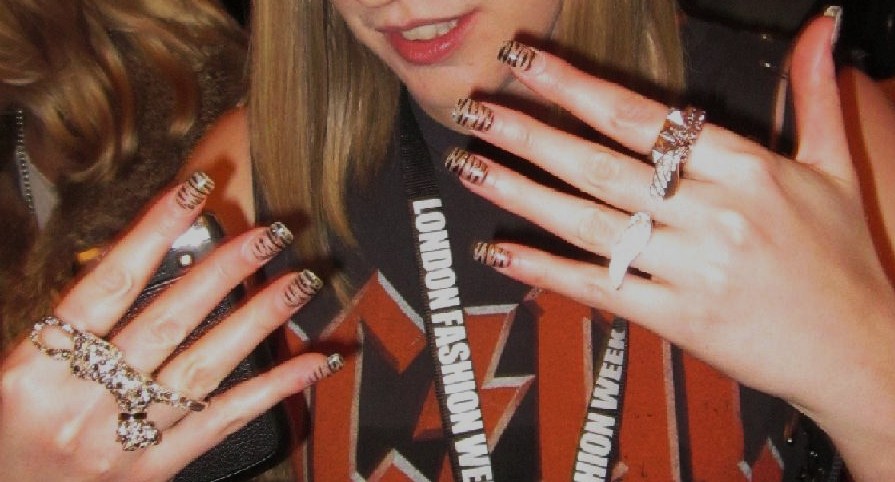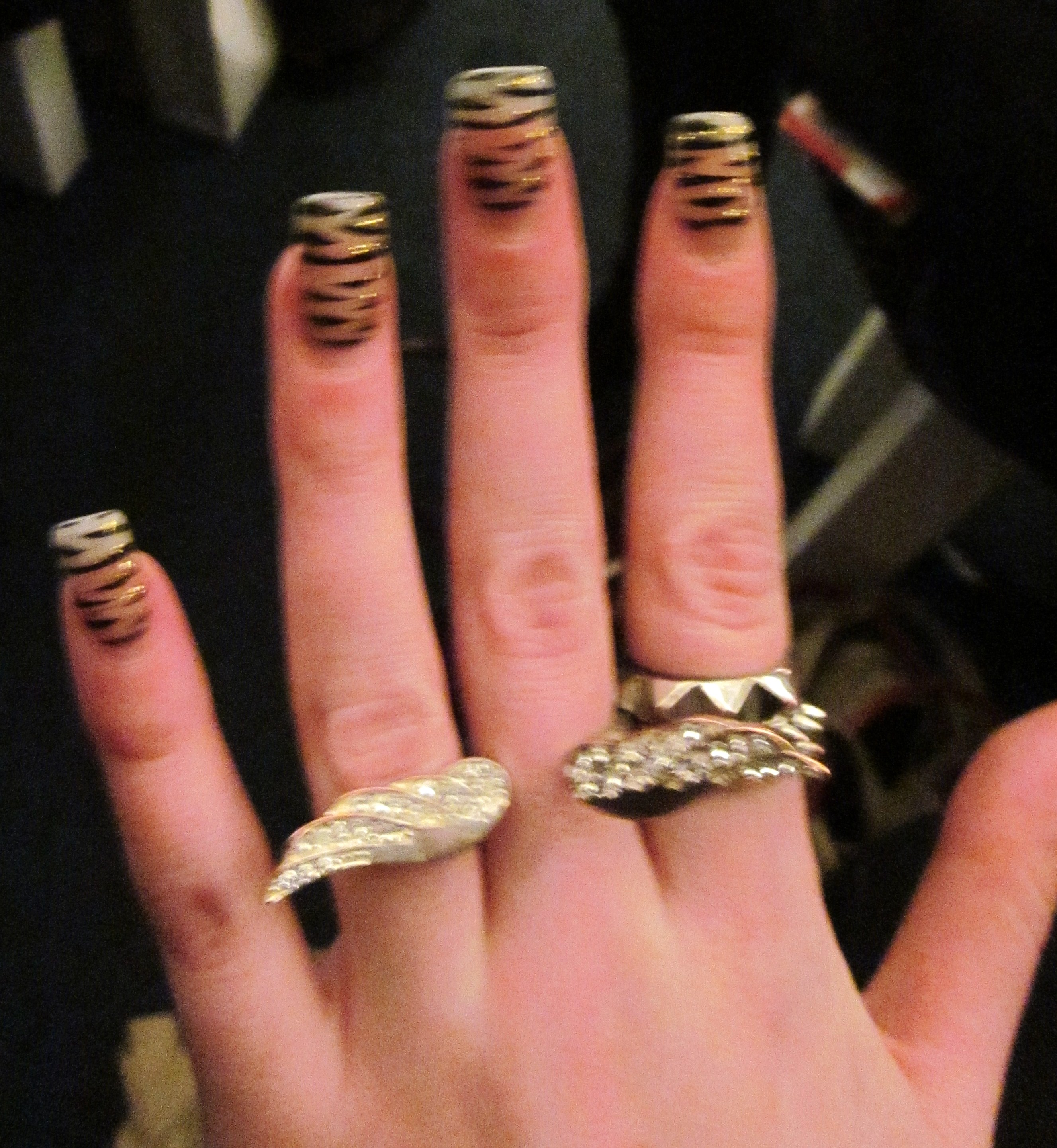 Importantly, she also accessorised with some amazing gold finger-candy. Glitter, wings, studs, a leopard. All just what’s needed to set off those pro nails!