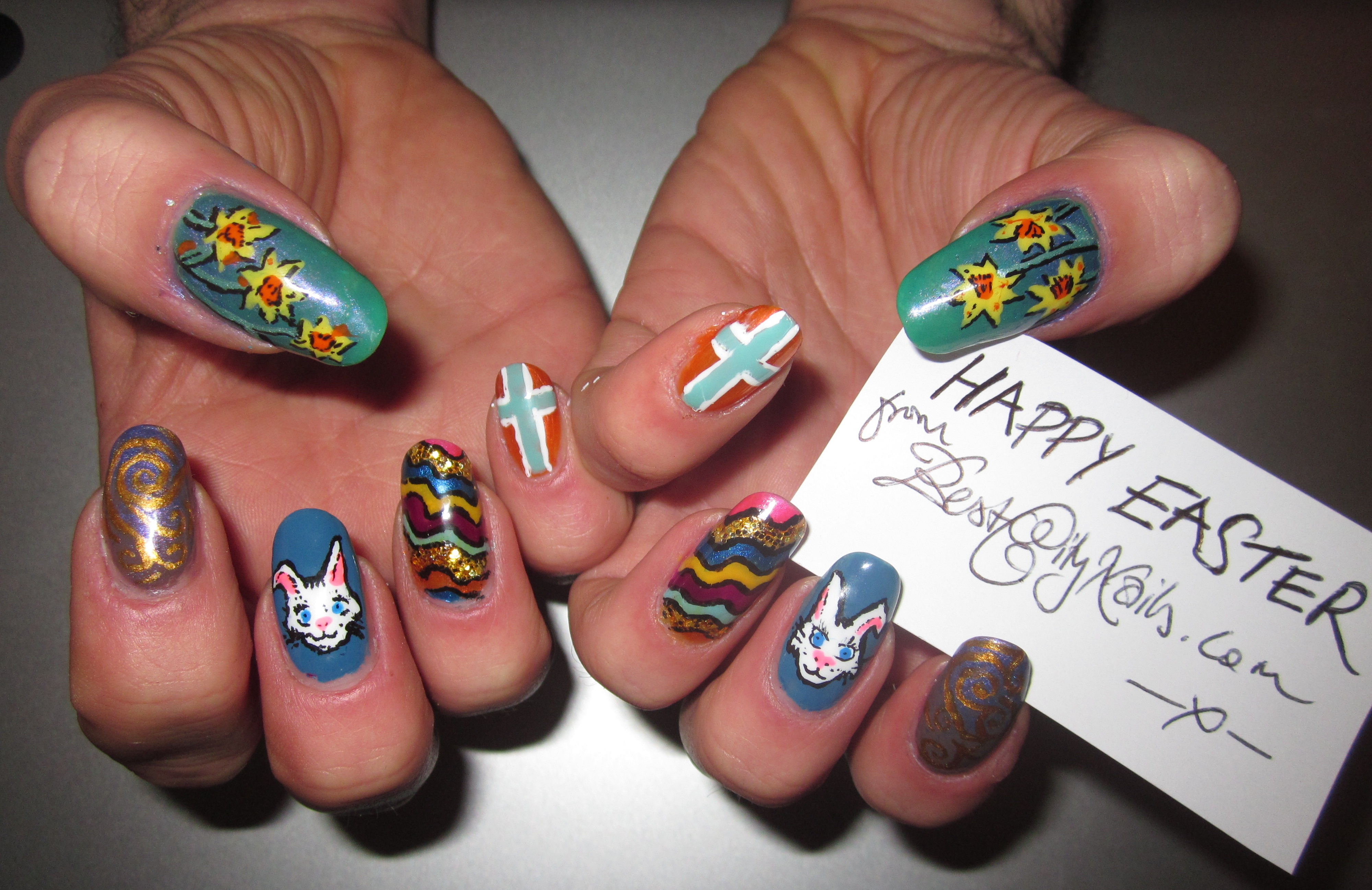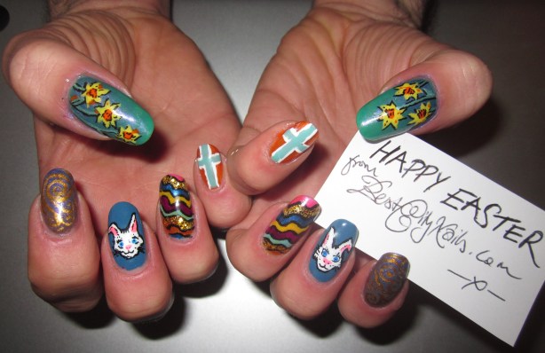 For our Easter nails we have gone for two nails decorated with patterns inspired by ones you typically find on springtime confectionary packaging, some Easter bunnies, some daffodils, and a Christian cross in springtime colours, to remind us of the sacrifice of Christ.
