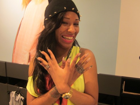 “I used to have a Blackberry but my nails were actually completely ruining the keys, so I have just changed to an iPhone and I hate it. I absolutely hate it! I’m like [mimes trying to use a touch screen with a really flat finger.]”