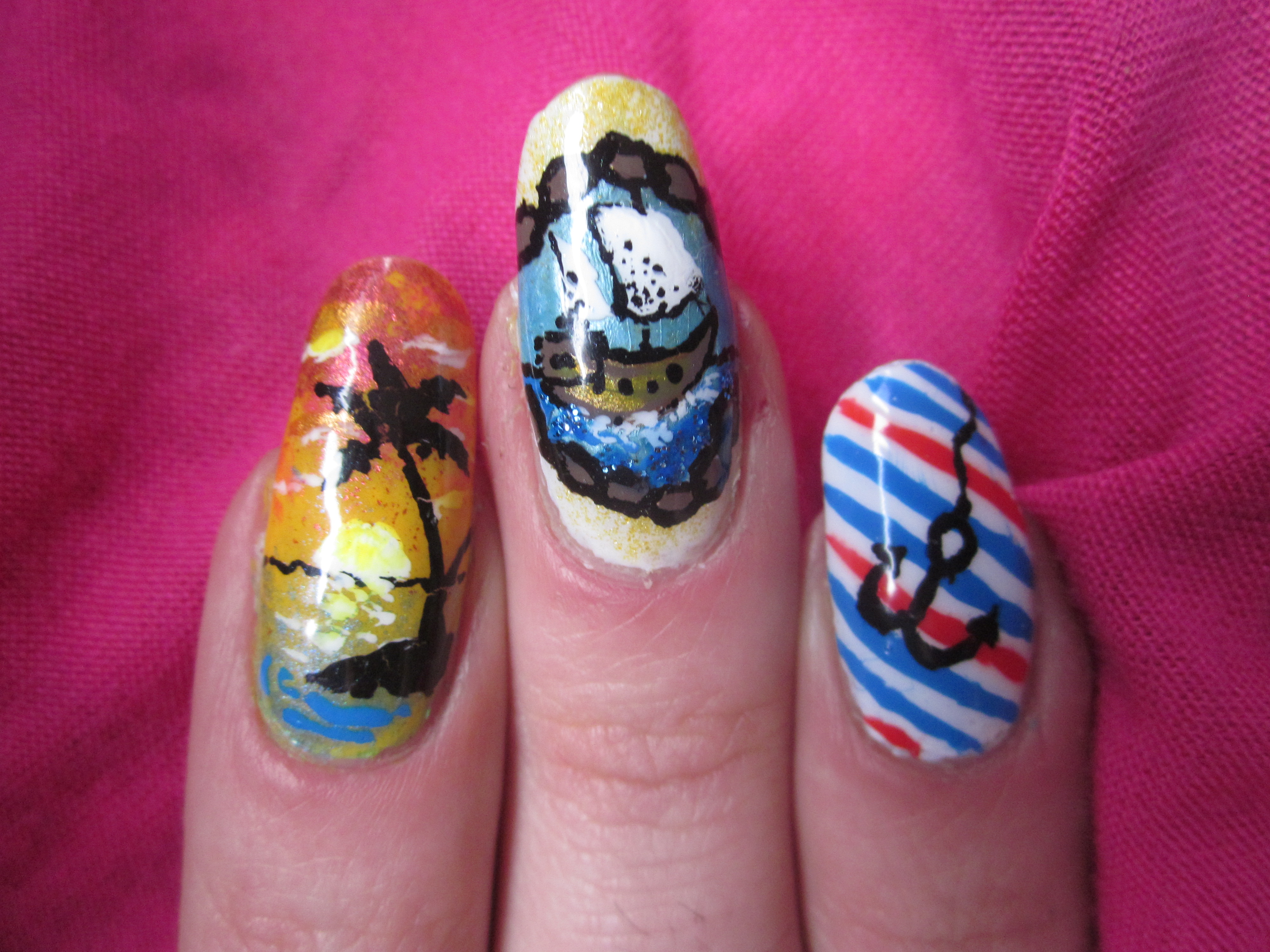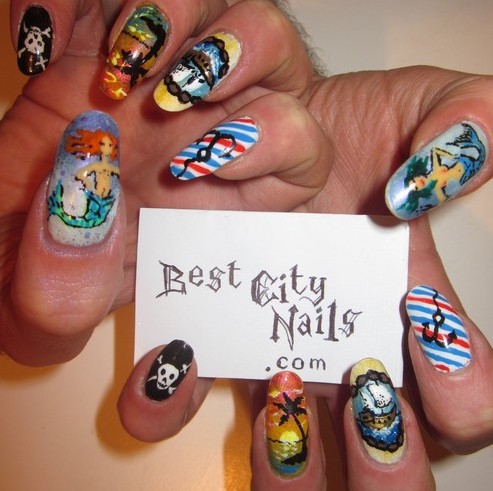 Standard skull with crossed sword and bone, the desert island and sunset (a classic 90s nail motif) a ship, circled in rope over a parchmenty effect (white dappled with yellow powder) an anchor, and some merpeople!