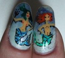 The usual techniques have been used: base colour of eggshell blue, Barry M loose eye shadow powder sprinkled on top of this, then the basic shapes and colours to build the characters and their clothes, then a layer of Seche Vite to dry, then black line details with a liquid eyeliner, finally another layer of Seche Vite and some 3D butterflies from the nail section in Poundland.