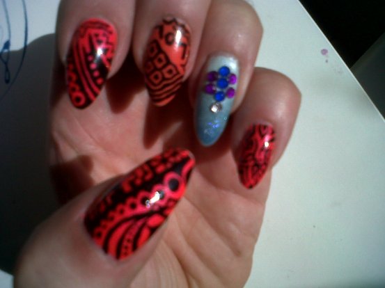 The main difficulty here is whether to top coat over the crystals. If you do, they stay on for weeks but they loose their sparkly-ness as the top coat smooths over all the facets. If you just glue the crystals to a finished nail and leave it at that, they might stay on for two or three days. YOUR CALL.
