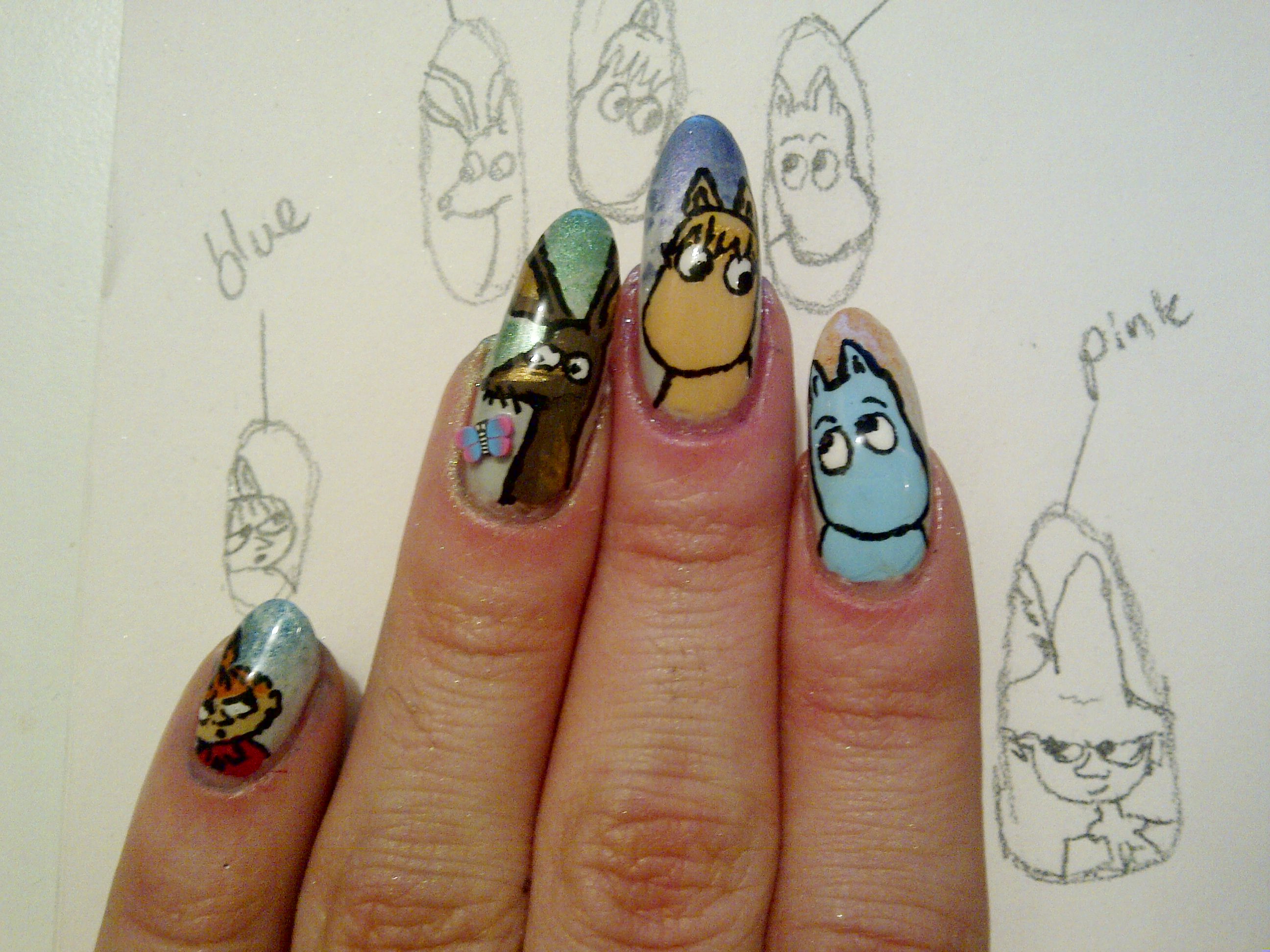 Snufkin and the Hemulen. You can see one of the butterfly 3Ds here. I do realise one nail is a lot shorter. Reminder that we’re working with REAL nails here. This thumb died before I came across the useful trick below.